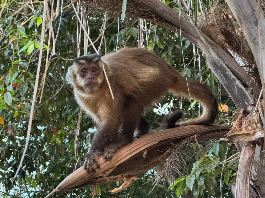 At first daylight, I crossed the yard when I was greeted by a young Capuchin monkey that was rummaging around in one of the palm trees for its breakfast.