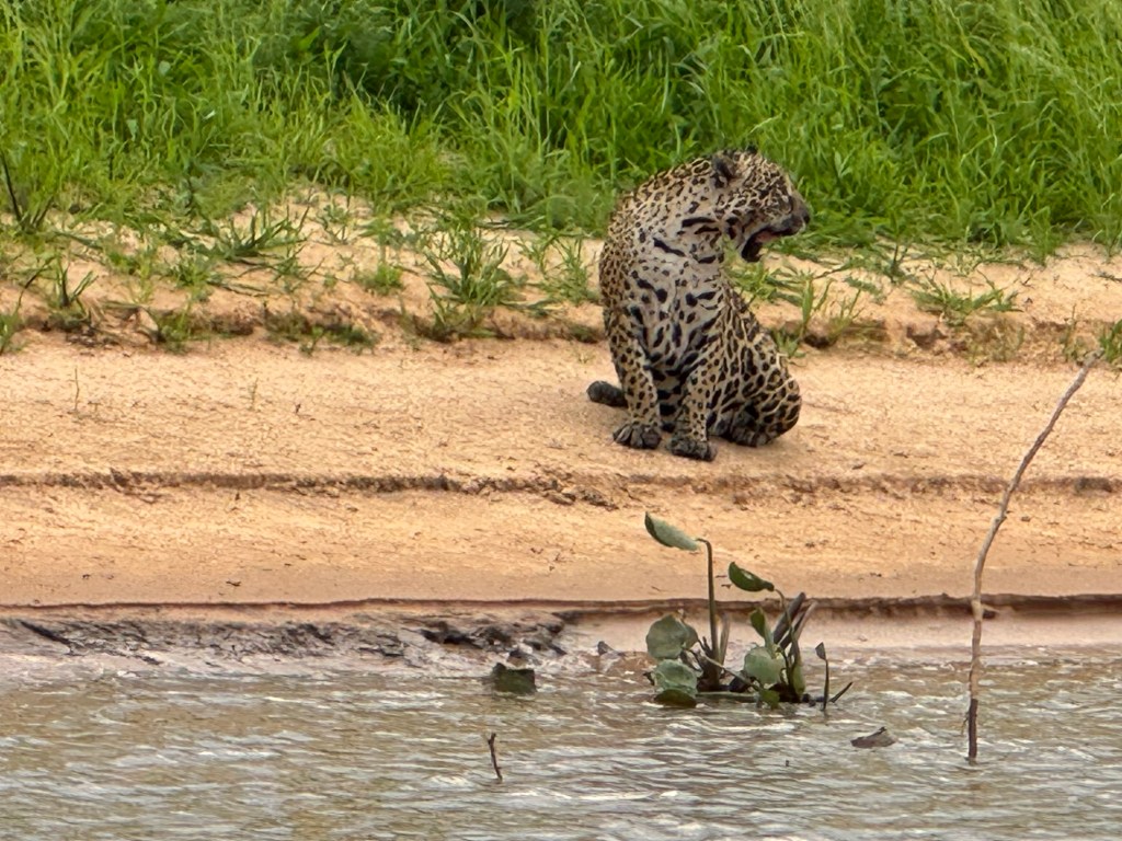 The next jaguar we saw was less camera shy, sunbathing on one of the small sand beaches that could be found alongside the river, which were normally populated by groups of capybaras. The automated shutter mechanisms of the cameras next to me went wild…..