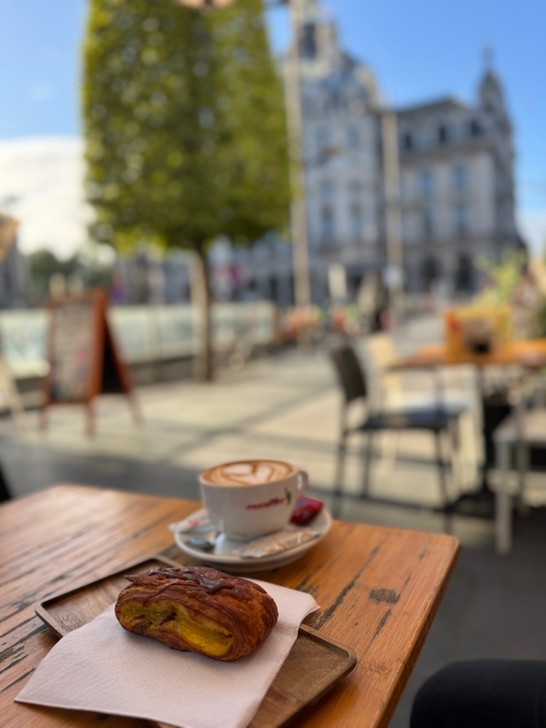 Settling at a small table outside of the coffee shop, I am turning into a member of the audience, seated in the front row of another daily performance at the theatre of life on Koningin Astridplein.