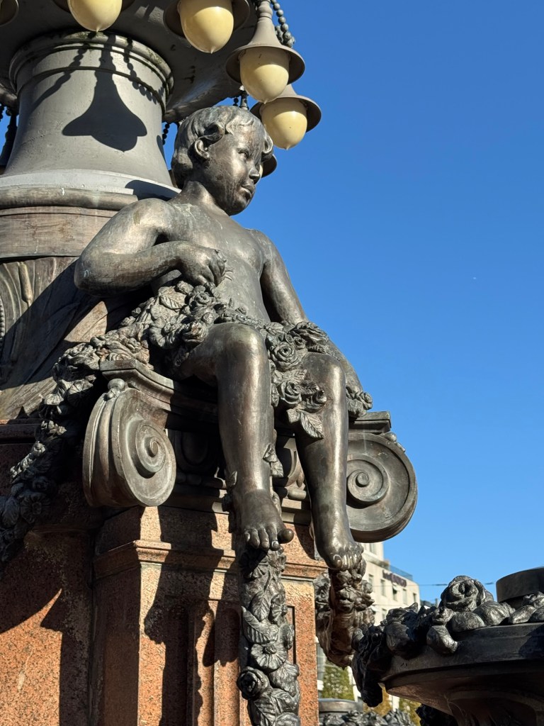 A tourist appears to be lost next to the bronze statue of a naked child sitting on the base of one of the two elaborately decorated lamp posts in the middle of the square, a couple is hugging and kissing not far from a long row of rental scooters, an old lady is walking her equally aged and clearly overfed toy dog and a delivery driver and a shop keeper are engaged into a heated argument, all under the watchful eyes of a young boy riding on a camel that is precariously balancing on a pedestal high above the roof tops.