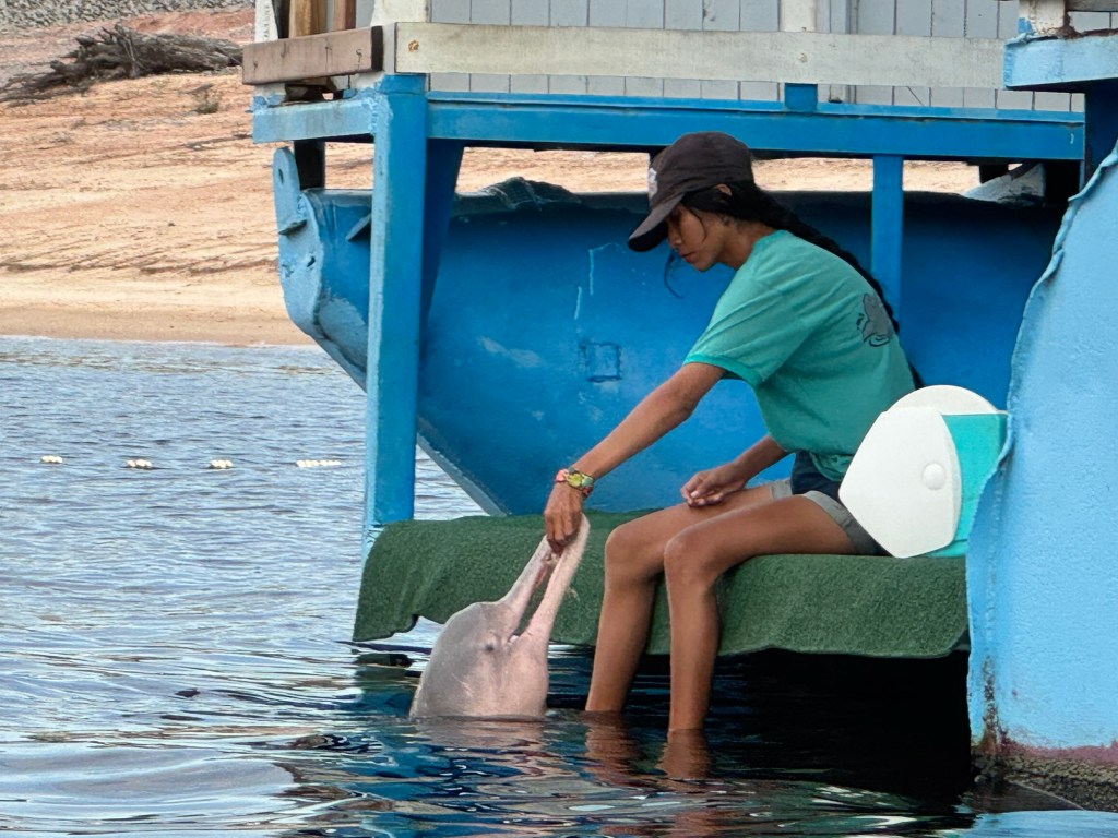 But this time my lucky run endured, and shortly after this brief encounter, the girl appeared and sat down at the edge of the float to give the botos their evening treats.