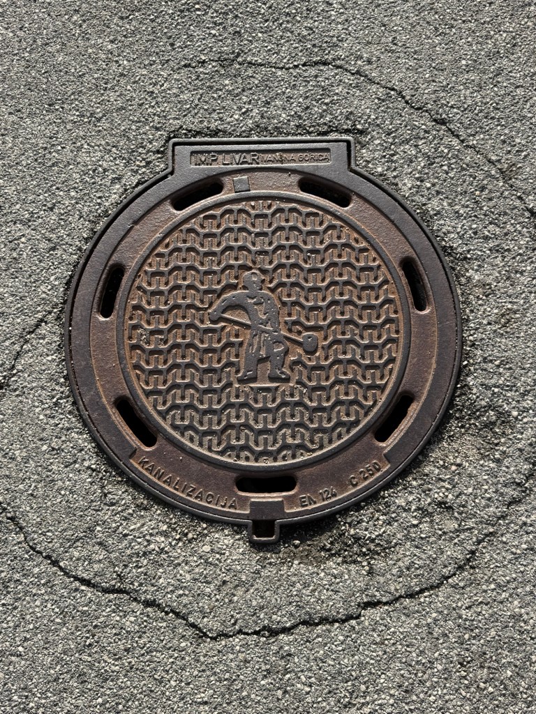 From here, the trail went mostly downhill right next to a small, meandering mountain road and then alongside the river, back to Idrija with its lace patterned pedestrian crossings.