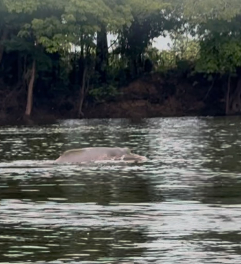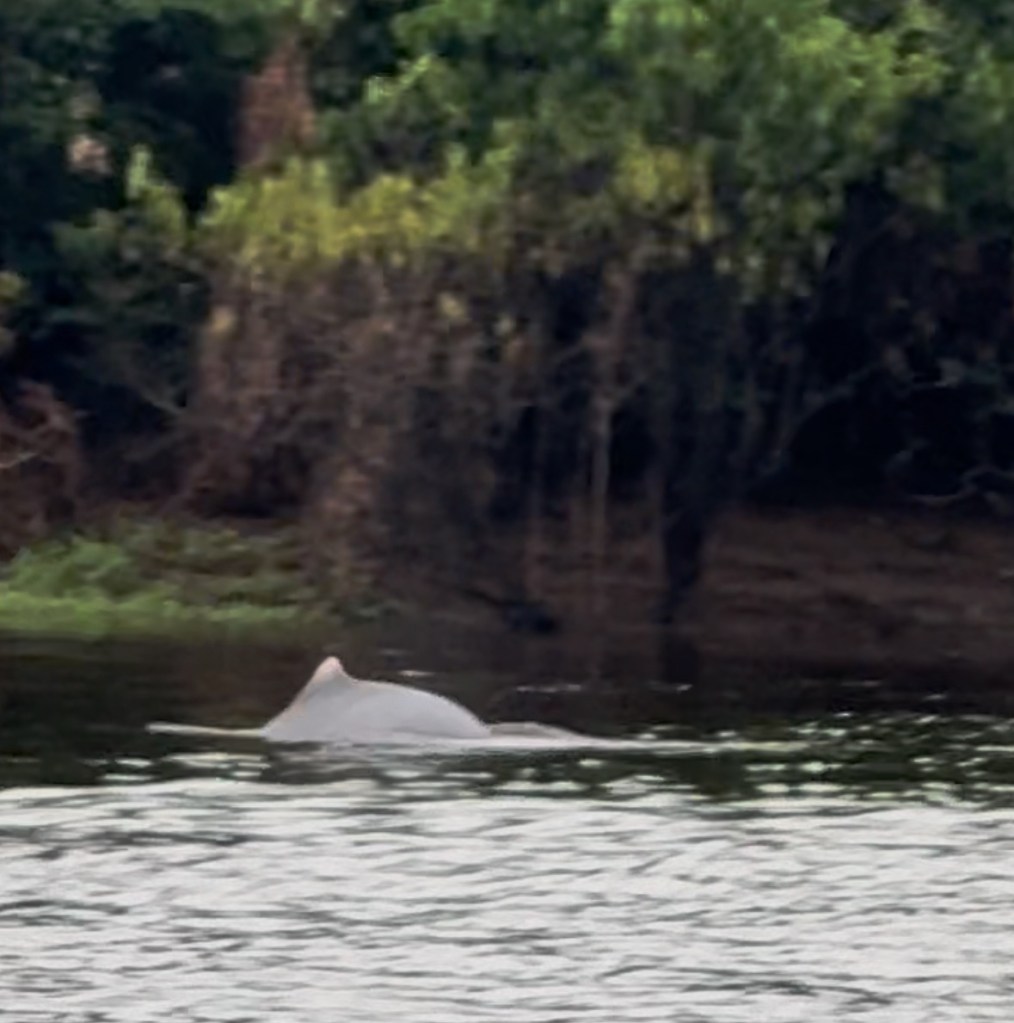 While not as large as its Cetaceaen cousin, the exhaling sound was the same and sure enough, looking to the other side of the river two distinctive pink backs, nearly devoid of a dorsal fin, were breaking the surface of the water.
