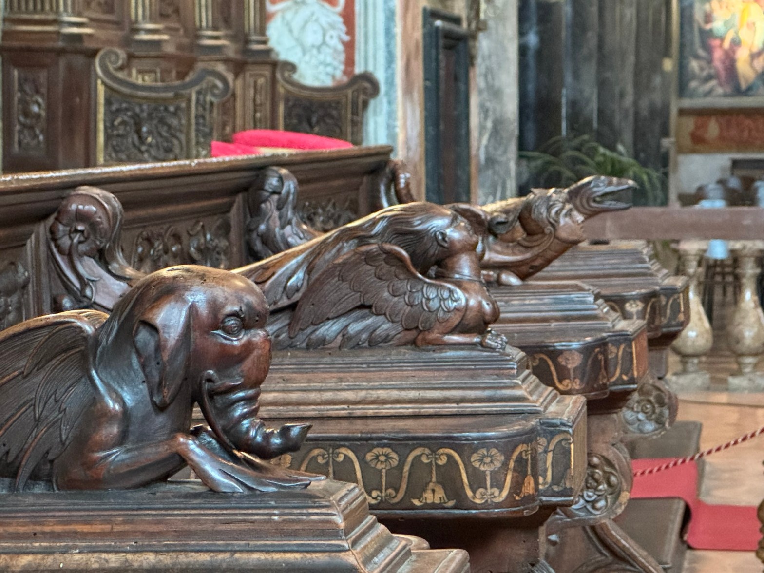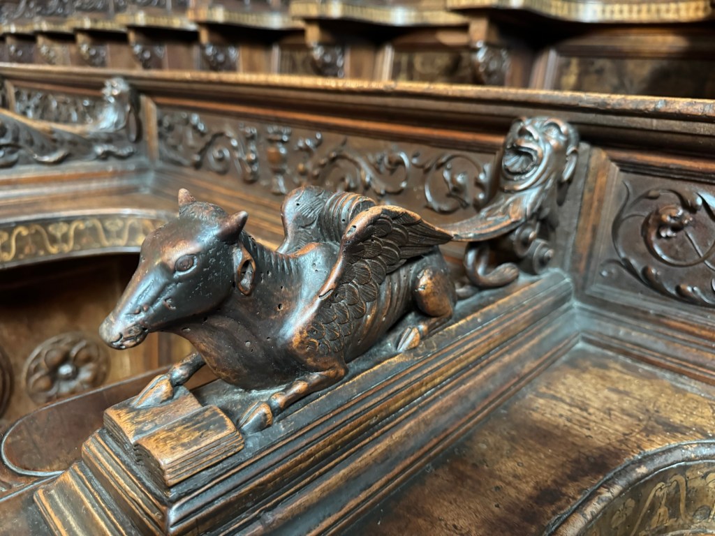 Crossing the nave and standing in front of the wooden choir seats, I then found myself among an assembly of the weirdest creatures one could imagine, as if conjured straight out of a psilocybin-fuelled Hieronymus Bosch painting.