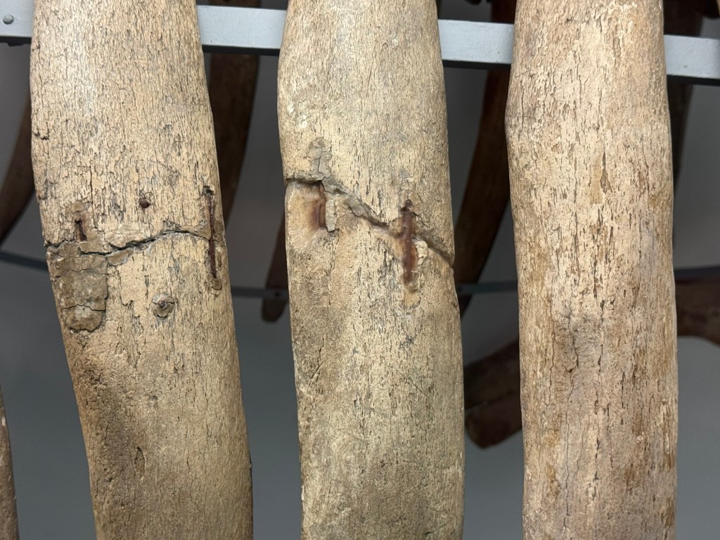 While some of the ribs, solid without a marrow cavity, were patched together with rusty steel wire, at least its caudal vertebral column appeared patched together with bones from different animals and while the animal was lagging its rudimentary pelvic bones and lower front limbs, it still was an impressive display, especially when standing right next to it.