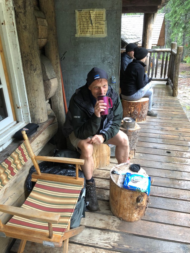 Trekking North along the Yoho River past the “Laughing” Falls, brought us after 3 1/2 hour – unfortunately mostly in the rain – to the Twin Fall Chalet – an old timber structure with a lot of history which was run for many years as a tea house. Unfortunately Fran Drummond the very charismatic (70+year old !) proprietor who is said to still carry all supplies for her guests to the cabin herself , wasn’t in ( possibly shopping for new hiking boots?!….), so that we had to make do with a cup of tea on the front porch