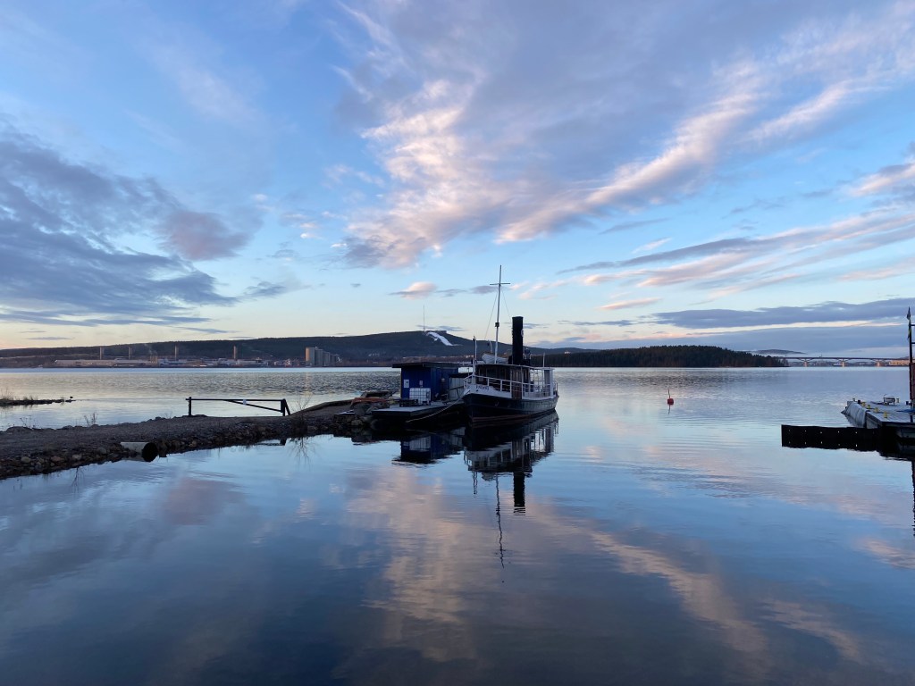 The somewhat sleepy harbour is sheltered by Alnön, a low lying and completely forested island in the East, which at one point counted more than ten saw mills.