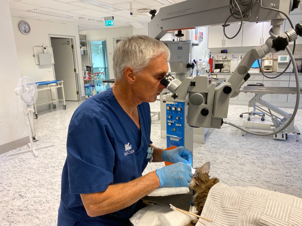 Finally – when being presented with a cat with a hardly visible foreign body in her cornea, Cecilie (“The Oracle” – as she always knows where everything is……..) one of the excellent head nurses suggested that I might like to make use of the surgical microscope for this case !……