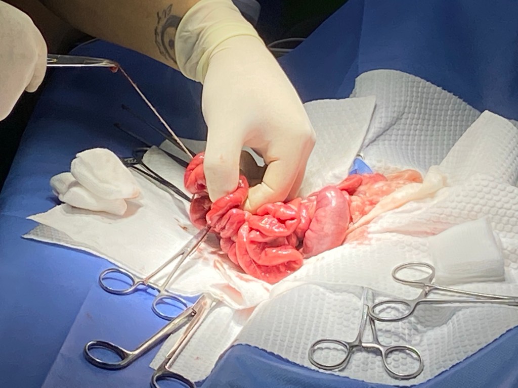 a 3 year old cat has first played with and then eaten a piece of string and this is now strangulating the whole of the small intestine starting at the pylorus (the opening of the stomach that leads into the intestine).