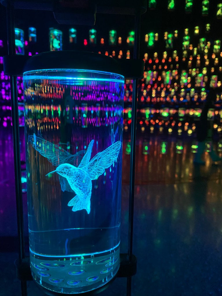 As in a vision from a Stanislav Lem novel one enters a darkened room where small glass vials with colourful hollograms of all living and extinct creatures are suspended from an invisible ceiling and the seemingly infinite columns of floating spots of light in this room leaves you with both an idea of the complexity of the biodiversity on our planet and at the same time with a feeling of dread that genetic storage facilities like these might indeed become a necessity in the not so far future.