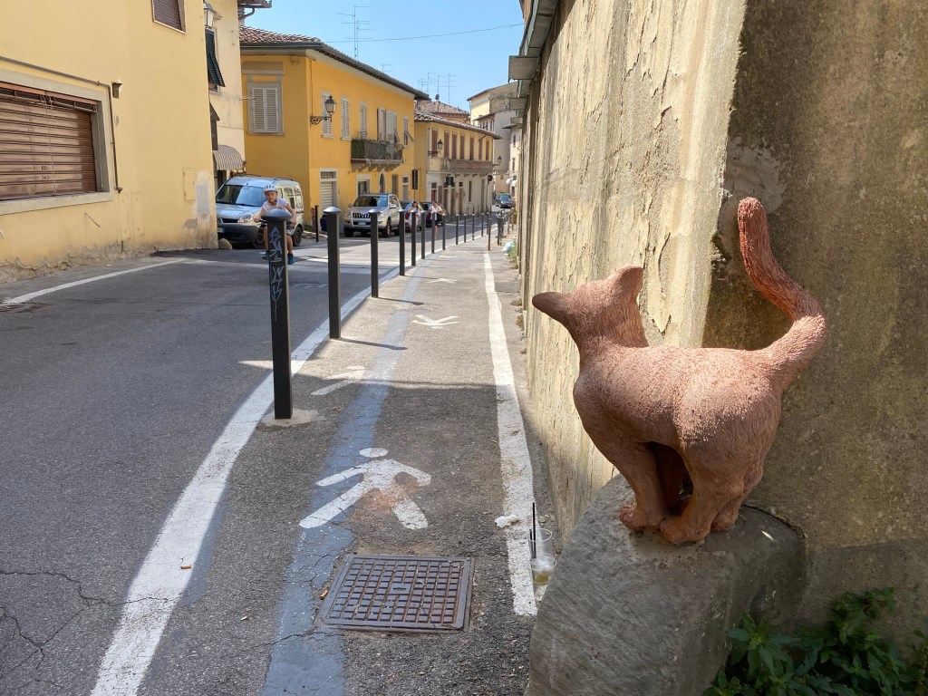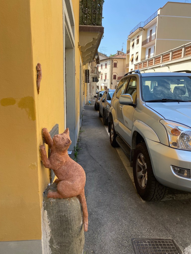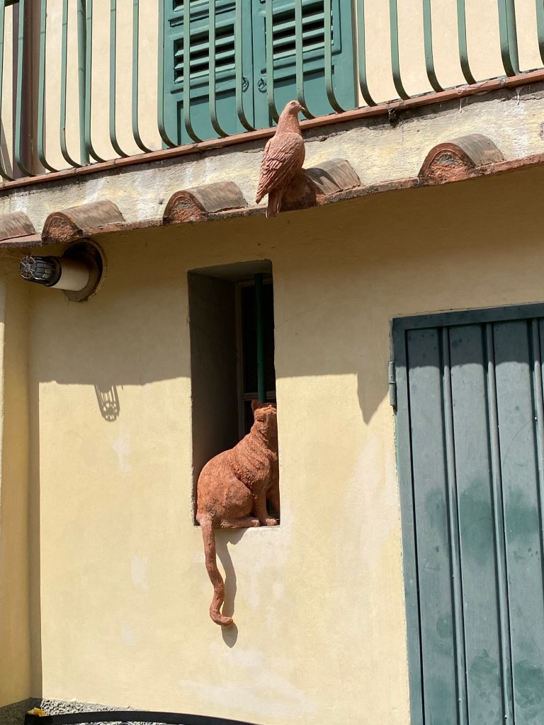 The cat in the window frame is for various reasons unlikely to get hold of the pigeon on the roof – not only is she obese, but the angle is also not great for a leap and……..as with all the cats in this street, her muscles and in fact her whole body is made of terracotta!