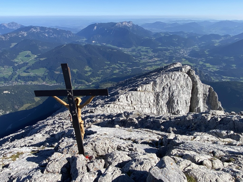 After another 1 and 1/2 hours with some scrambling on thankfully very dry rocks, one of the peaks, the “Hocheck” was reached and with that a brilliant view over a large section of the Northern Alps.