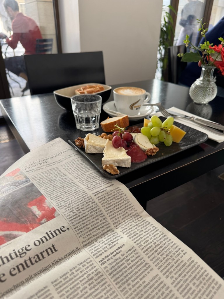 With my circadian rhythm in disarray, and my personal morning now moved to the middle of the day, I started with a walk into town and a plate of bread and local cheeses at the Café of the local art museum. As it is custom in this part of the world, the newest issue of the local news paper was laid out, for guests arriving without company.