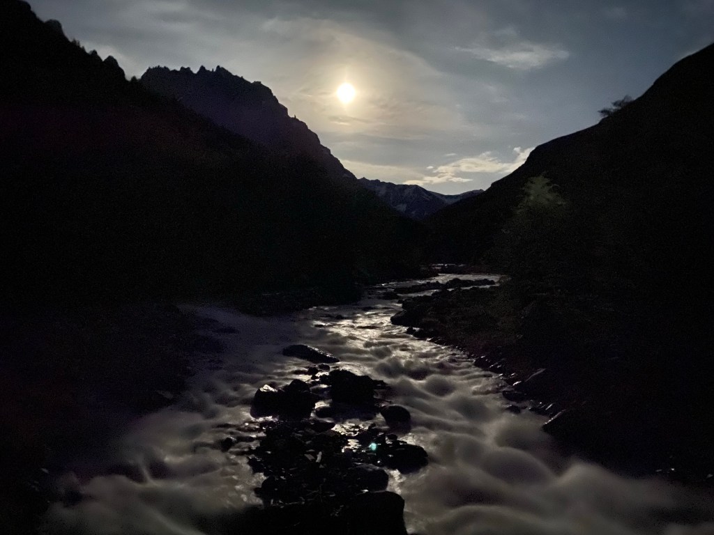 A mountaineer’s absolute nightmare, every few minutes an avalanche is breaking off from the overhanding edge of the glacier which is now exposed to the sun. The tons of ice, tumbling down the mountain face, then hit the porous rock below causing at times massive landslides which resulting in clouds of dust which are the drifting over the nearby forest. I have never seen such an active mountain face and we are well advised not to get closer to this scene of pure carnage.