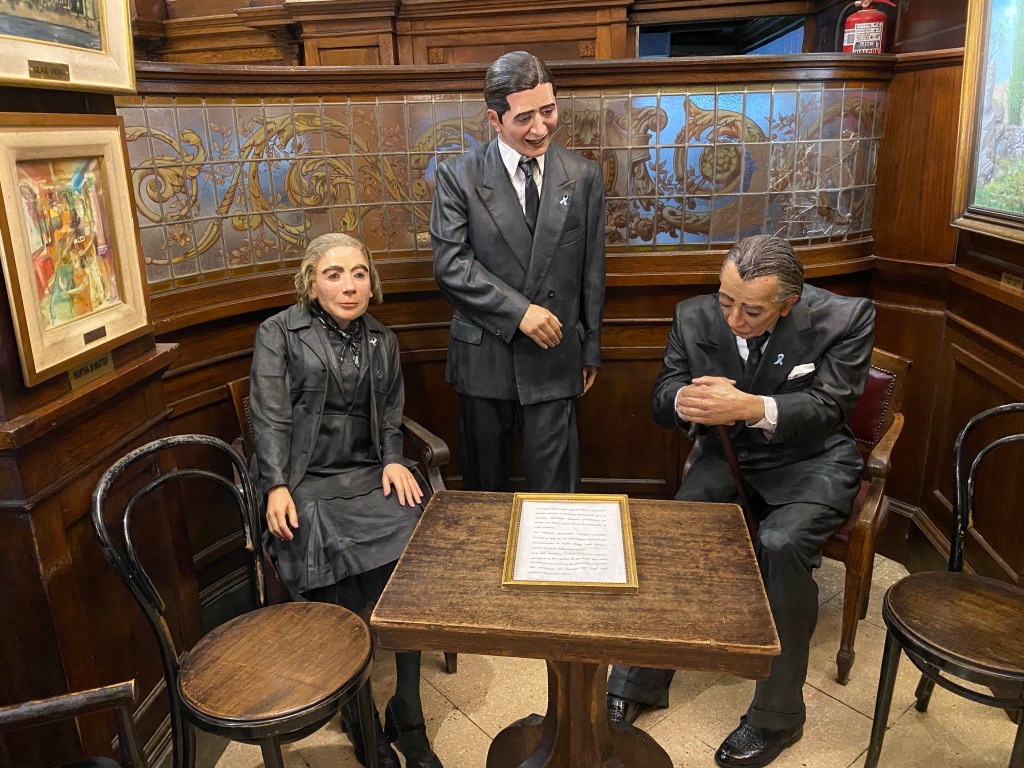 As Borges was apparently a very frequent visitor here – as indicated by a wax model (of not quite Madame Tussauds’ standard) in a corner of the cafe – I was wondering if they might have ended up at one of these tables as well ?…..
