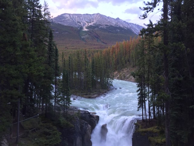 The water of this spectacular waterfall feeds into the Athabasca River which then flows thousands of miles North into the Arctic Sea.